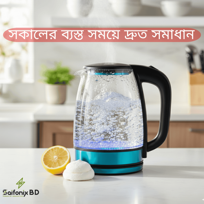 মাত্র ২ মিনিটে আপনার প্রয়োজনীয় পানি ফুটান! Saifonix BD নিয়ে এলো আধুনিক ও স্টাইলিশ প্রিমিয়াম গ্লাস ইলেকট্রিক কেটলি, যা আপনার রান্নাঘরের কাজকে করবে আরও সহজ এবং দ্রুত। Saifonix BD ব্র্যান্ড হিসেবে সবসময় সেরা মানের পণ্য নিশ্চিত করে, যা দীর্ঘস্থায়ী হয় এবং উন্নত নিরাপত্তা ব্যবস্থা (যেমন: অটো কাট-অফ, পানি ছাড়া না চলার সুবিধা) ব্যবহার করে। আমরা কার্যকারিতার পাশাপাশি পণ্যের সুন্দর ডিজাইনের উপর জোর দিই। শক্তিশালী ১৫০০W হিটিং এলিমেন্টের কারণে পানি দ্রুত গরম হয়। এটি টেকসই এবং স্বচ্ছ বোরোসিলিকেট গ্লাস দিয়ে তৈরি, যা স্বাস্থ্যকর এবং পরিষ্কার করা সহজ। পানি ফুটানোর সময় কেটলির নিচের অংশ জুড়ে একটি আকর্ষণীয় নীল LED আলো জ্বলে ওঠে, যা দেখতে অসাধারণ লাগে। পানি ফুটে গেলে নিজে থেকেই বন্ধ হয়ে যায়, ফলে বিদ্যুৎ সাশ্রয় হয় এবং দুর্ঘটনার ঝুঁকি থাকে না। কেটলিতে পানি না থাকলে এটি স্বয়ংক্রিয়ভাবে বিদ্যুৎ সংযোগ বিচ্ছিন্ন করে দেয় (Boil-Dry Protection)। ২.০ লিটার ক্ষমতা, যা পুরো পরিবারের জন্য যথেষ্ট এবং সহজেই কর্ডলেস বেস থেকে তুলে ব্যবহার করা যায়। আপনার প্রতিদিনের চা, কফি বা অন্যান্য রান্নার কাজের জন্য এই কেটলিটি হতে পারে সেরা পছন্দ!